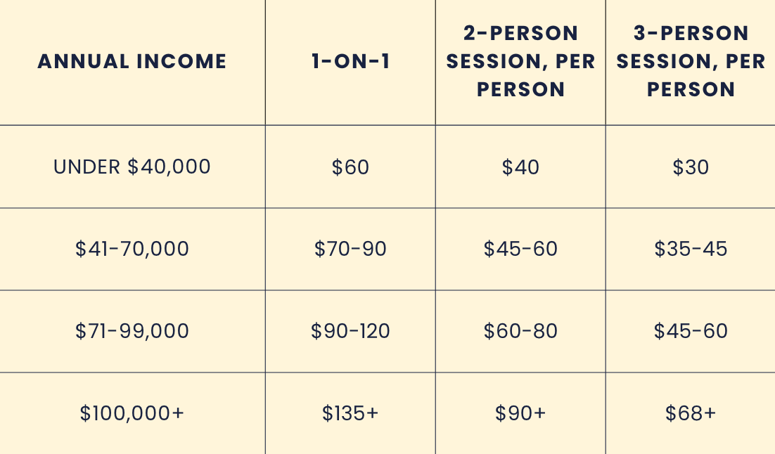 1-1 and small group training sessions are priced on a sliding scale. Sliding scale pricing relies on everyone paying at the level they can actually afford - which means folks with more money pay more, so that folks with less can pay less.